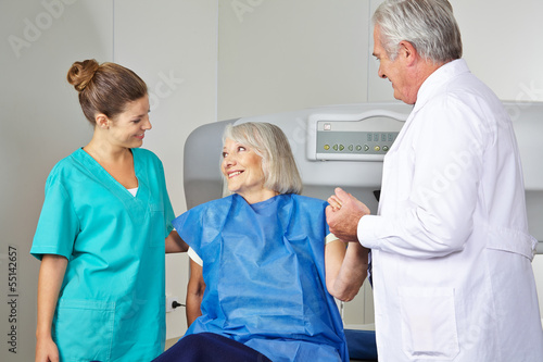 Arzt redet mit Seniorin vor Knochendichtemessung