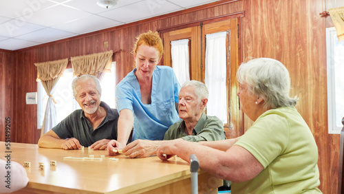 Freundliche Altenpflegerin und Senioren im Gespräch