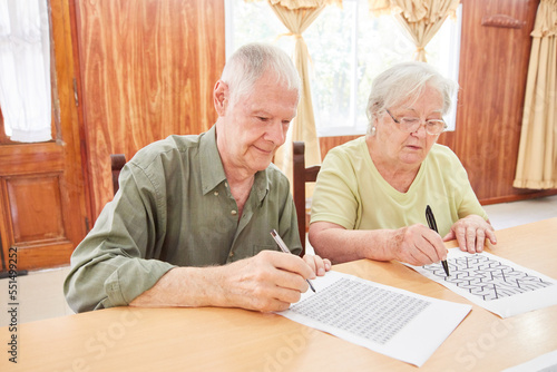Altenpfleger hilft Senioren Paar beim Rätsel lösen