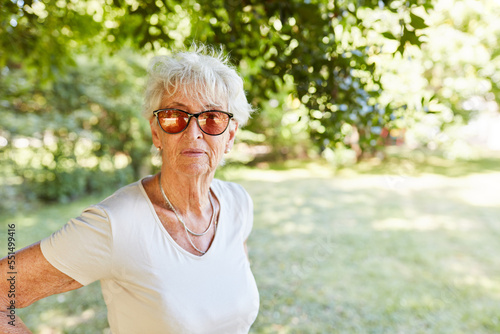 Elderly woman in sunglasses on a walk
