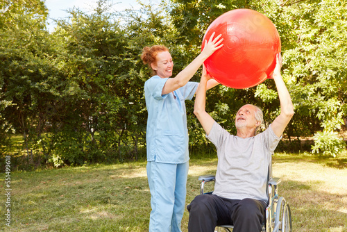 Senior in a wheelchair doing exercise with a gymnastic ball