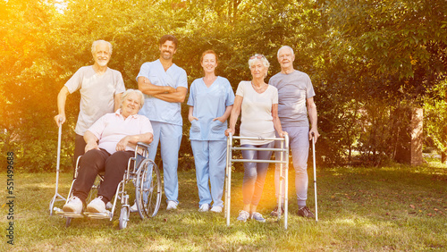 Gruppe Senioren mit Gehhilfe und Rollstuhl im Garten