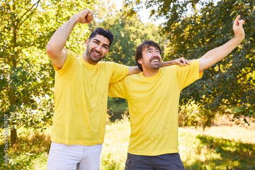 Zwei Freunde jubeln zusammen über einen Erfolg