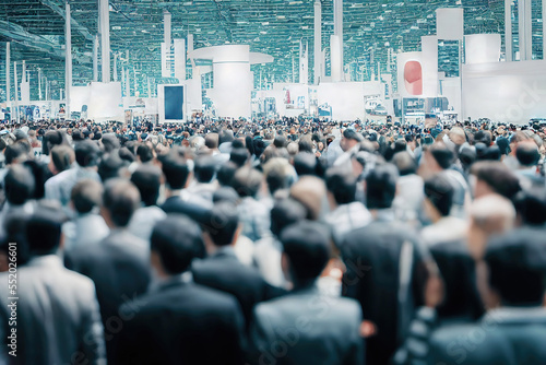 Large crowd of anonymous business people walking in exhibition hall (Generative AI)