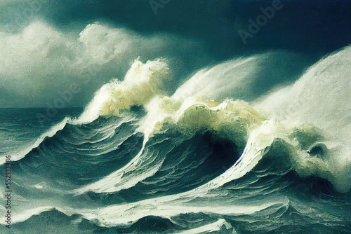 Dramatic stormy seascape with turbulent waves under dark clouds