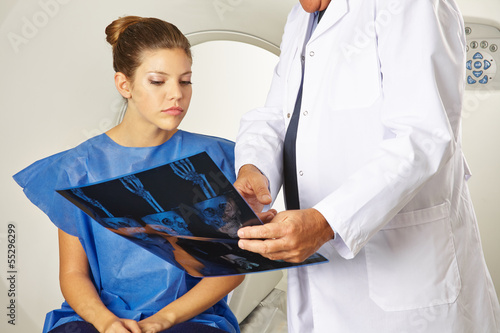 Arzt zeigt Patient Röntgenbilder nach MRT