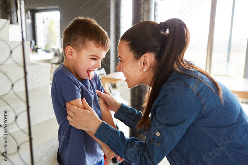 Junge zeigt seiner Mutter die Zunge als Frechdachs