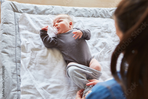 Happy smiling mother with baby on changing table