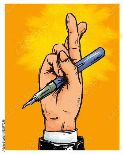 Hand von Geschäftsmann mit gekreuzten Fingern und Stift