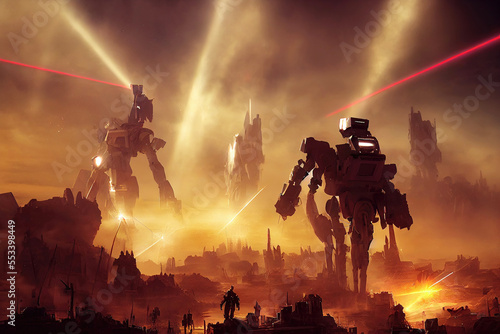 War robots attacking and fighting with laser guns on battlefield (Generative AI)