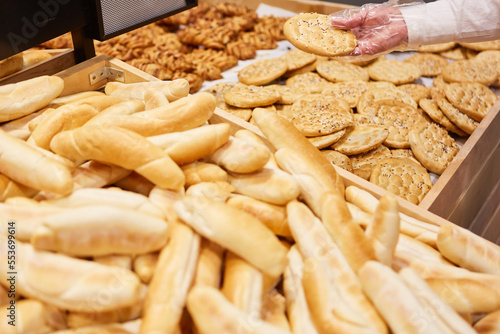 Kundin packt Fladenbrot in eine Plastiktüte im Supermarkt