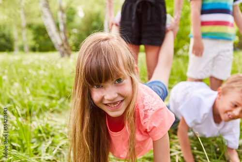 Group of kids playing wheelbarrow race competition