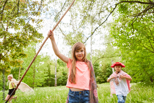 Girl holding stick and cape while playing with friends