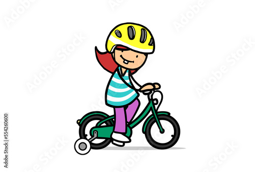 Cartoon girl learns to ride a bike wearing a bicycle helmet