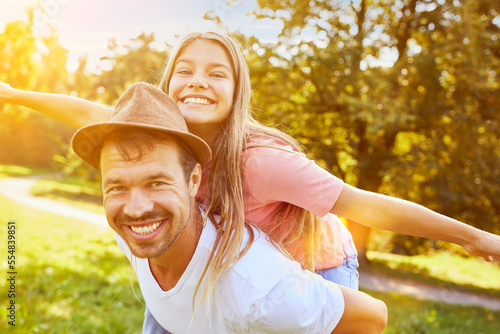 Happy father giving his daughter piggyback ride