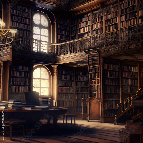 Long shelves with many old vintage books in bookstore (Generative AI)