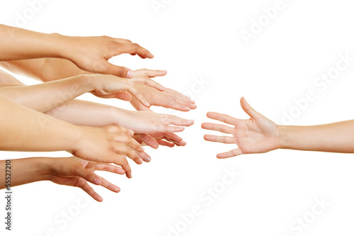 Many hands reaching sideways