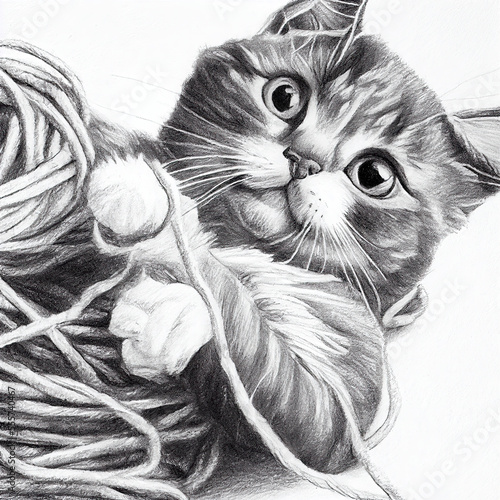 Cute cat entangled in yarn playing as pencil drawing (Generative AI)