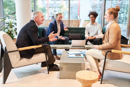 Happy team of business professionals discussing while sitting together at table in office lounge