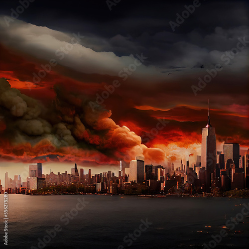 Doomsday in New Yyork City skyline with fire as Apocalpyse concept (Generative AI)