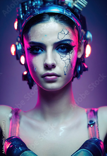 Young fictional female cyberpunk cyborg woman with glowing circuit boards (Generative AI)