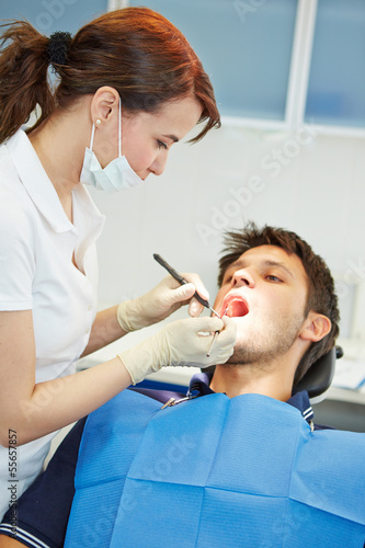 Zahnarzthelferin untersucht Mann beim Zahnarzt