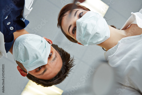 Zahnarzt und Zahnarzthelferin schauen von oben