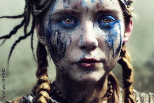 Angry fictional viking warrior with war paint in his face as closeup portrait (Generative AI)