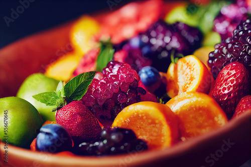 Fresh healthy fruits in fruit bowl as vegetarian food background (Generative AI)