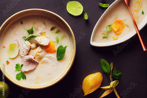 Top view of thai tom kha gai soup with fresh herbs and lemon (Generative AI)