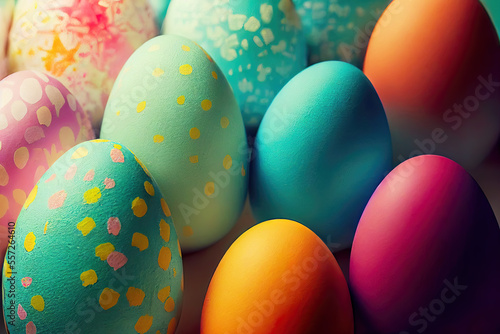 Close-up of many colorful easter eggs as background (Generative AI)