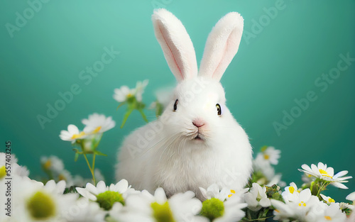 Cute baby rabbit as easter bunny on daisies as illustration (Generative AI)