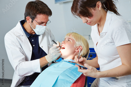 Zahnarzthelferin in Ausbildung lernt beim Zahnarzt