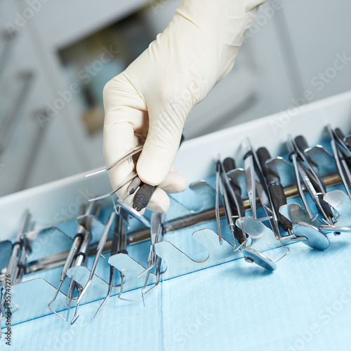 Hand vom Zahnarzt greift nach Handinstrumenten