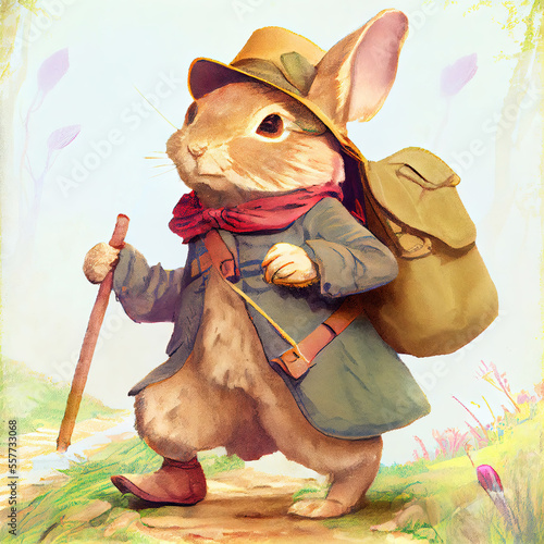 Cute easter bunny with backpack hiking as vintage style illustration (Generative AI)