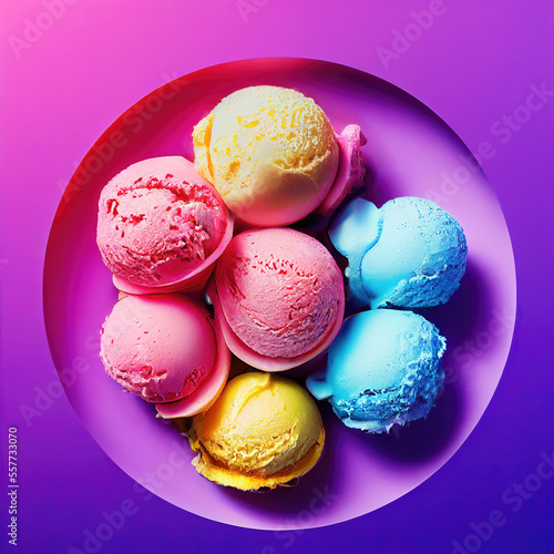 Colorful ice cream scoops on plate as top view food illustration (Generative AI)