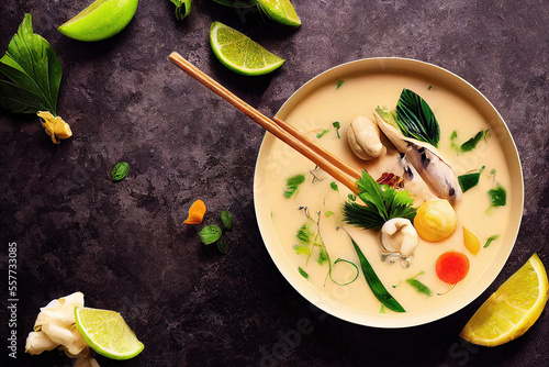 Top view of thai tom kha gai soup with fresh herbs and lemon (Generative AI)