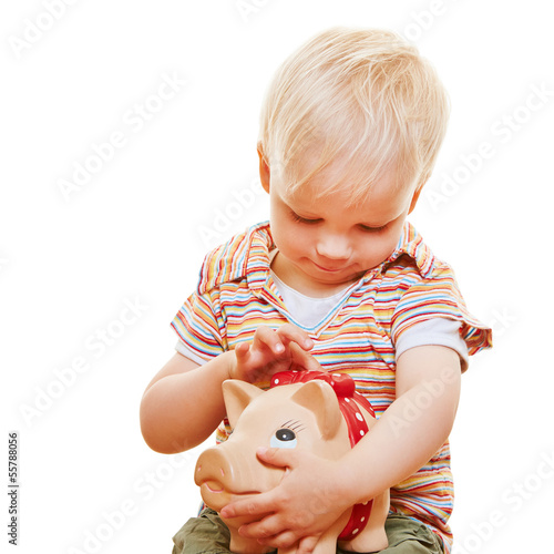 Kind steckt Münze in Sparschwein
