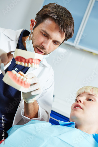 Zahnarzt erklärt Patient Behandlung am Gebiss