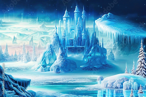 Magical fairy tale landscape with fantasy ice fortress (Generative AI)