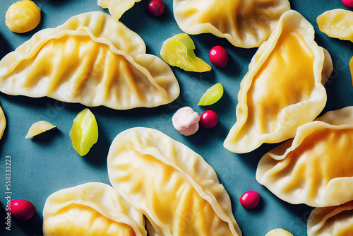 Fresh cooked pierogi as Polish food illustration in top view (Generative AI)