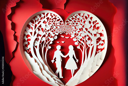 Romantic wedding couple in love as paper cut craft for Valentine's Day (Generative AI)