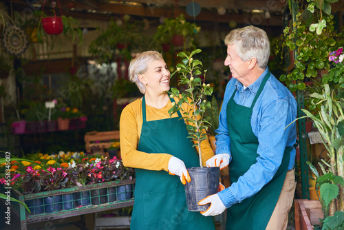 Gärtnerei Inhaber und Floristin tragen eine Zimmerpflanze