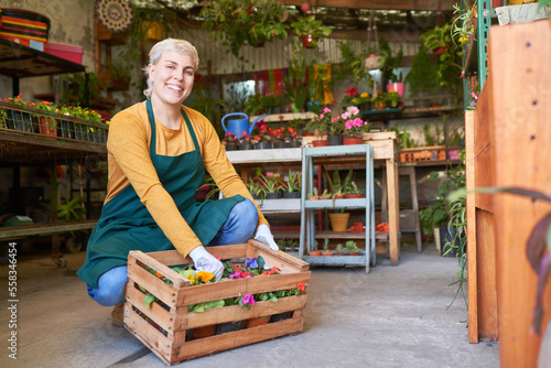 Lächelnde junge Frau als Gärtnerin mit einer Kiste Pflanzen