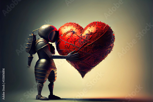 Lonely robot holding big red heart as love symbol for Valentine's Day (Generative AI)