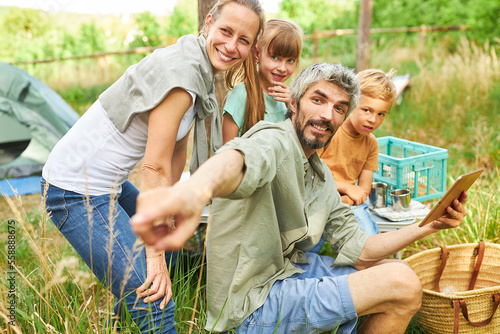 Man holding digital tablet camping with family in summer