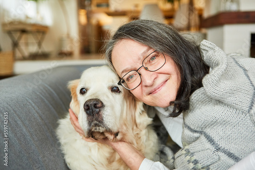 Alte Frau umarmt liebevoll ihren Retriever Hund