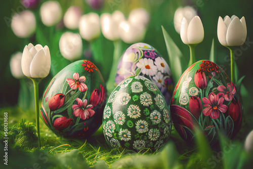 Beautifully decorated vintage easter eggs on grass amongst tulips as easter background (Generative AI)