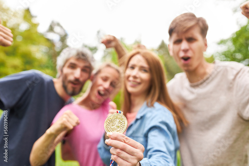 Cheering team proudly displays the winner's medal