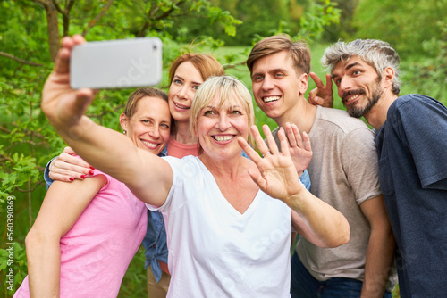Family on vacation with friends take selfie together